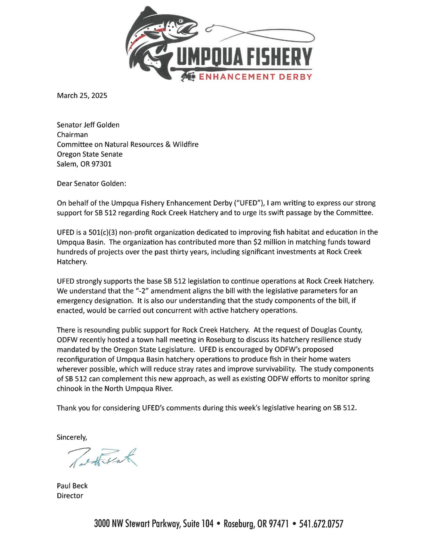 The Rock Creek Hatchery, a vital part of Oregon’s fisheries since 1925, was devastated by the 2020 Archie Creek Fire. This facility has historically produced fall and spring Chinook, coho, summer and winter steelhead, and rainbow trout, supporting local economies and recreational fishing. Senate Bill 512 aims to restore the hatchery by directing the State Fish and Wildlife Commission to operate a fish hatchery at Rock Creek and release the fish into the North Umpqua River. The bill appropriates $1.4 million for this purpose and declares an emergency, making it effective upon passage. The opportunity to submit a written statement in support of SB 512 is open until noon on Saturday, March 29th. Submit your comments here: https://olis.oregonlegislature.gov/liz/2025R1/Testimony/SNRW/SB/512/0000-00-00-00-00?area=Measures For reference, the Umpqua Fishery Enhancement Derby’s letter of support is attached.