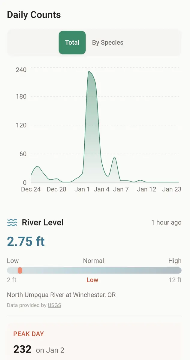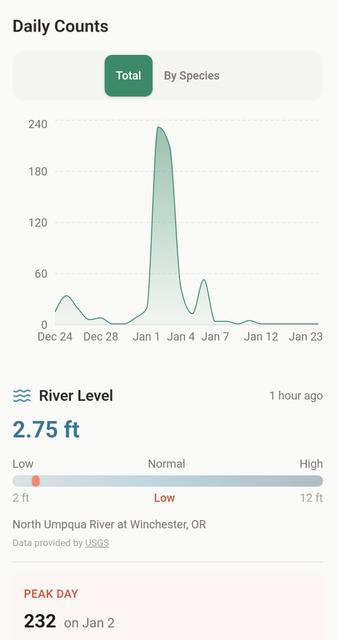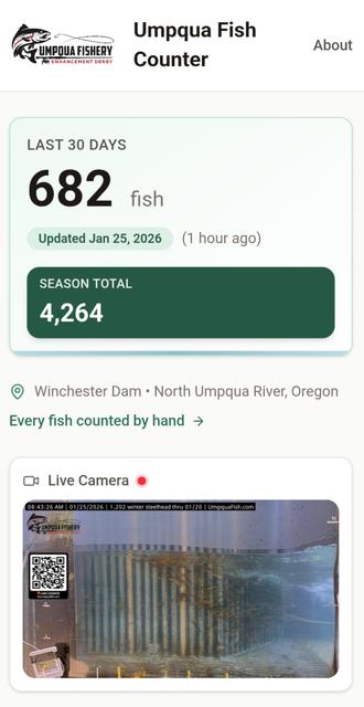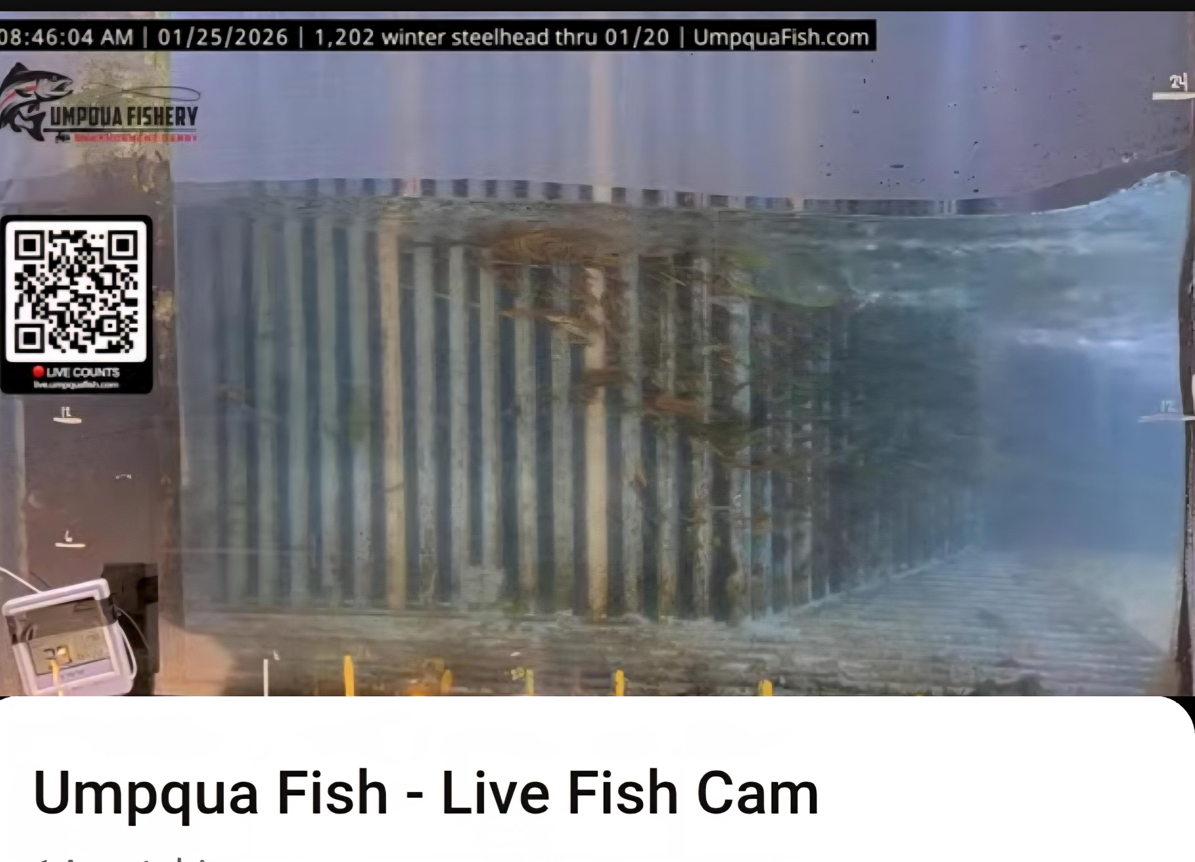 The Umpqua Fishery Enhancement Derby’s website has launched a new dashboard that includes the latest fish counts and river flows. Check it out here: https://live.umpquafish.com/ You can still watch the live-streaming video with up-to-date fish counts by species displayed on the ticker tape. And now you can find the latest actual counts by week or months and even the previous year. The USGS gage reading for the North Umpqua River just below this site shows the relative flows that are very key to upstream migrating salmon and steelhead. Check it out on a regular basis to see what is happening in the underwater world.