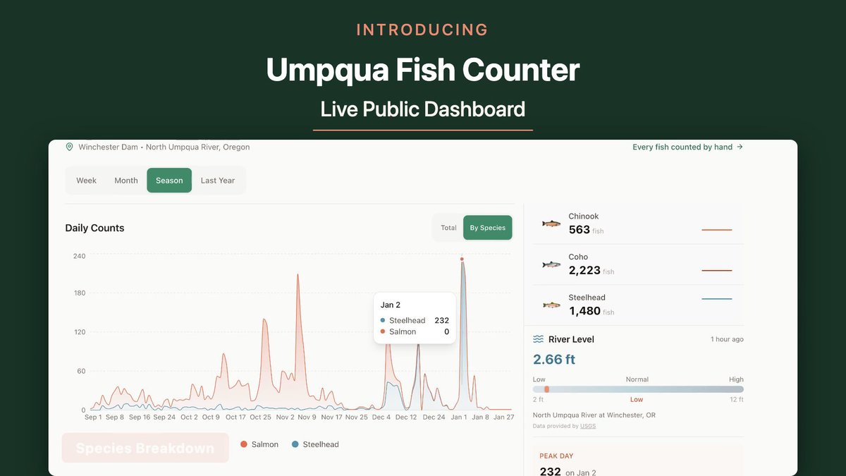 Here's a short video showing the updated live dashboard, real-time fish counts, river flows, and a cleaner layout. Watch it here: https://live.umpquafish.com/