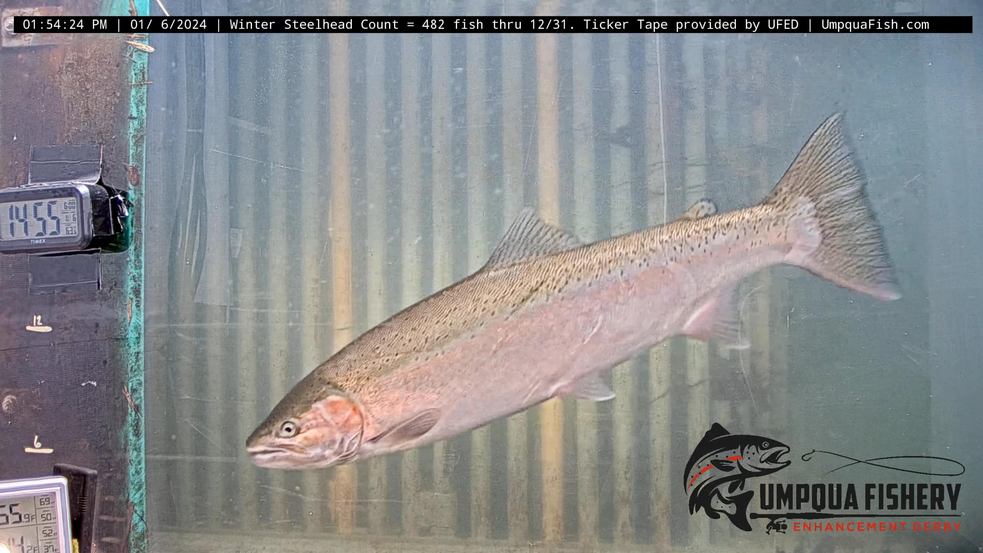 The total fish numbers for October 1 - to December 31, 2023, are actual counts of different species recorded by the Umpqua Fishery Enhancement Derby 24/7 live-stream video. There were 8,108 fish that passed upstream through the fishway at Winchester Dam. In December, 482 winter steelhead and 102 coho salmon were counted. The total coho count is 7,053 during this period with only a couple more weeks in January for the 2023 brood year. The North Umpqua winter steelhead return for 2023-2024 is off to a good start with the recent warmer water temperatures with 105 fish counted on December 31st. To date, 10 winter steelhead have been fin-clipped and counted as hatchery fish.