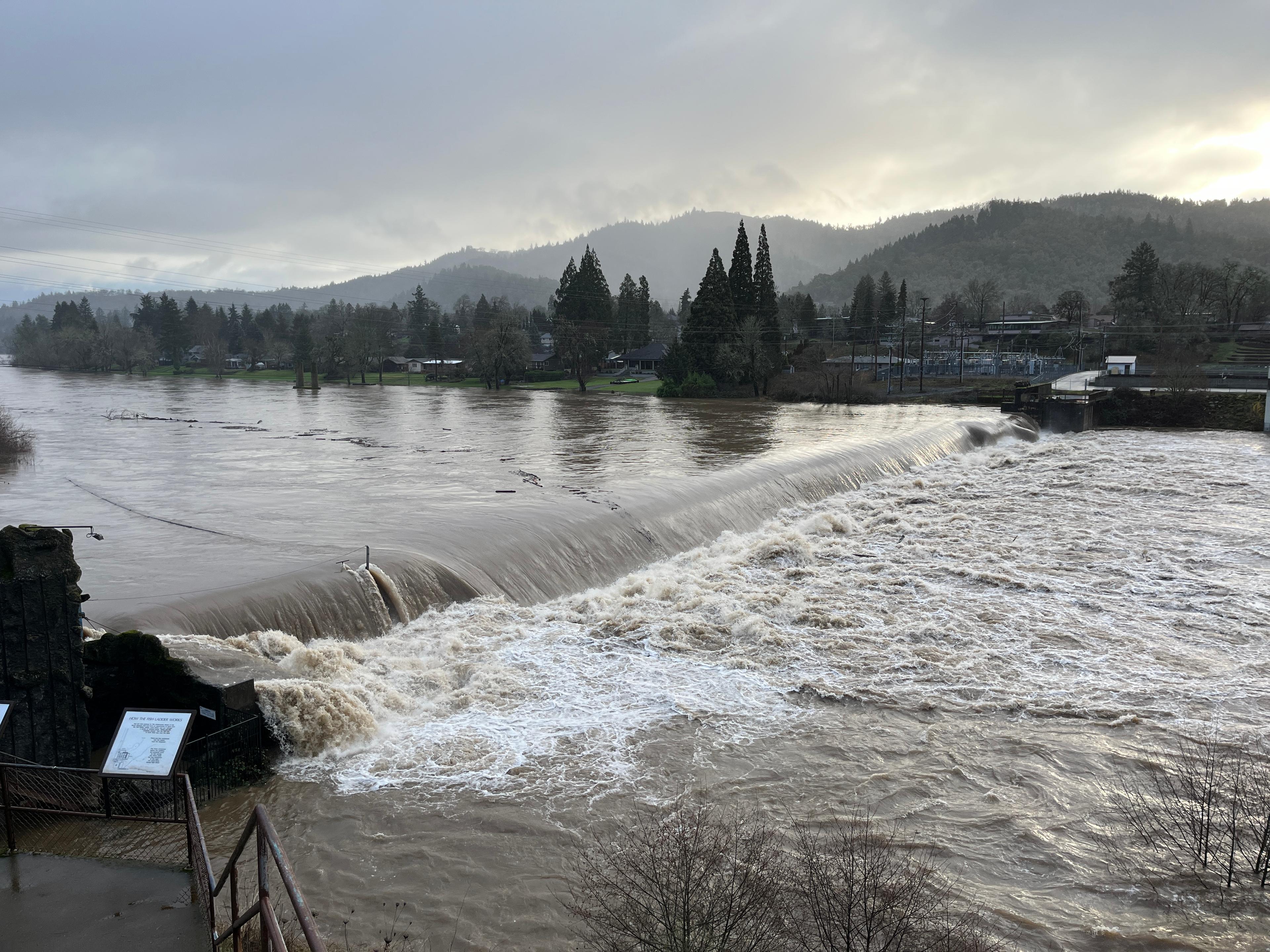 The North Umpqua River high flow event peaked yesterday Sunday December 29th at 2:30 PM with the USGS gage reporting 49,000 cfs and 17.7 feet gage height. This was near the 18-foot "action" height, but well below the 26-foot flood stage. This morning the river flow has decreased almost 50 percent in just 18 hours to about 26,000 cfs and 6 feet lower. The predicted flows over the next few days will continue to drop and remain around 10-15,000 cfs. Photo taken Sunday, December 29 at 9:23 AM at the Winchester Dam. River was at 15 feet at 39,000 cfs.
