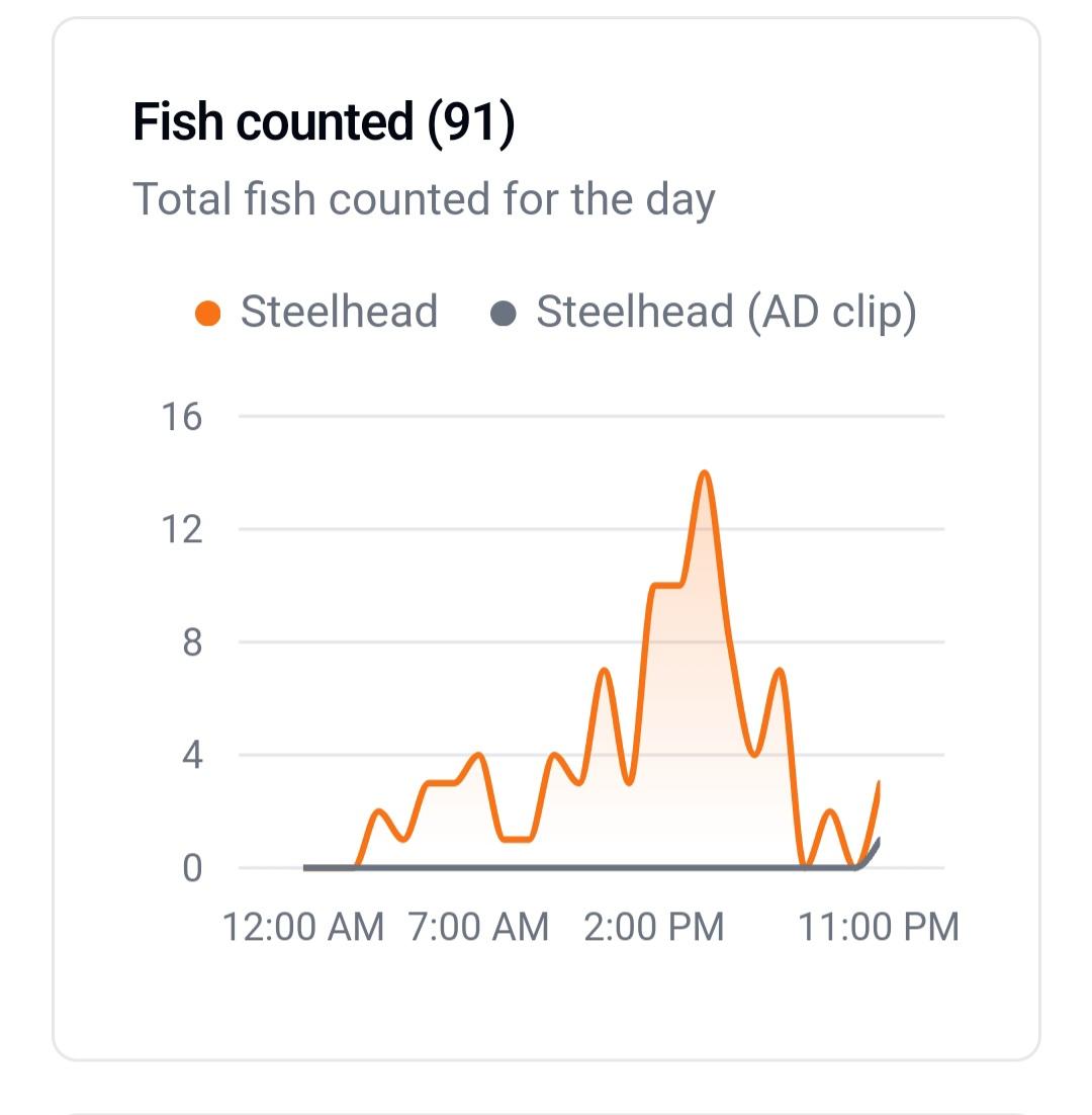 After 14 days of very cold water temperatures and low flows, and not seeing a steelhead.....the warmer rains that began on January 31st triggered the 91 fish to start moving upstream within just a few hours in the early morning of February 1st. There were no changes made at the dam or within the fishway structure during this fish passage period.